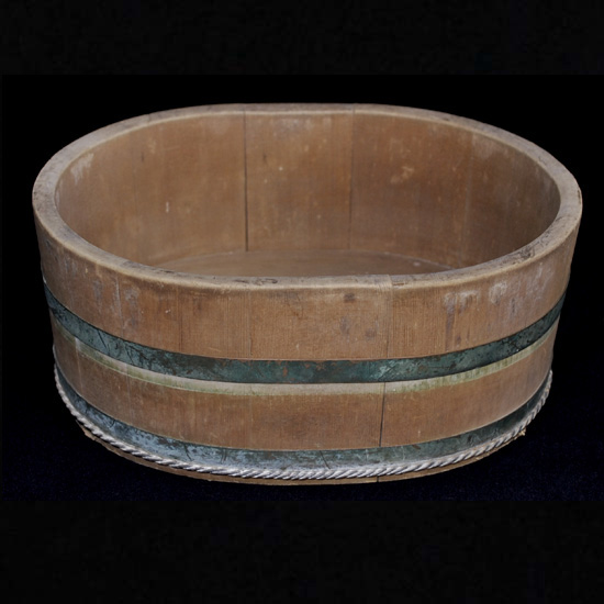 2577 昭和レトロ民芸 高島屋 特級 No .1 たまご型湯桶 今はあまり見る事の無い卵型の湯桶、 裏底に、高島屋のロゴマーク及び、( 特級 ) ( No .1) の焼印が施された当時の高級品です。 厚さ 1 cm 程の板 ( 材種は不明 ) を、銅坂と銅線の箍で絞めてあります。 日本製のUSED品 ◆サイズ◆ ( 外寸最大部分 ) 27 × 21 . 5 × h : 11 p 程 ◆状態◆ 外観上、汚れや傷み箇所が随所にあるも、特に酷く傷んだ箇所はありません。 尚、経年の未使用保管により隙箇所があります。 ( 画像参照下さい ) \ 2000 送料-y80 ![]() ![]() ![]() ![]() ![]() ![]() ![]() ![]() |